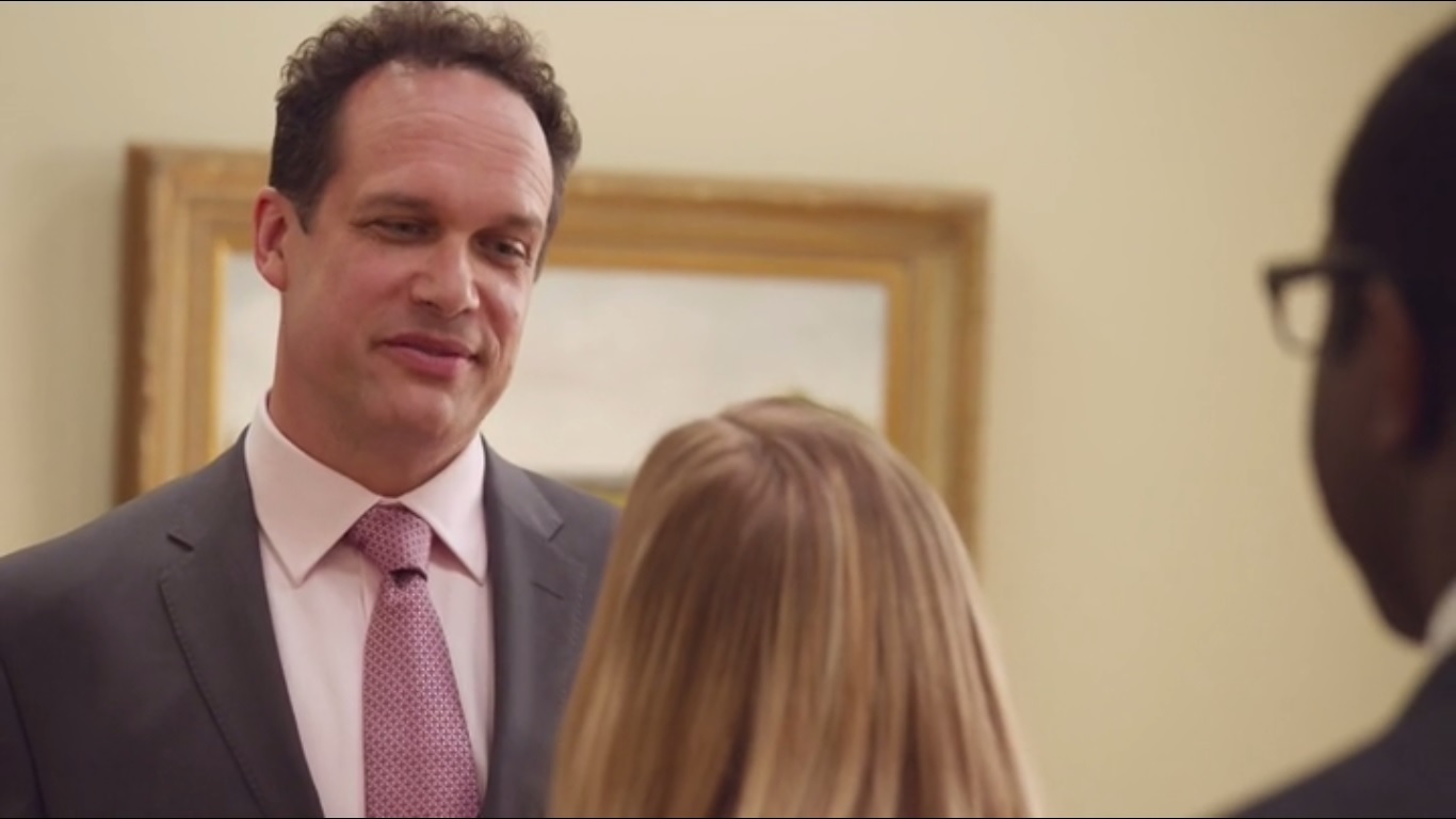 So Selina has a very brief Press Spray with the Prime Minister of Israel, Mike and Jim let Selina know about that removed crazy triangles looking piece of artwork: turns out it was the only work of an art by a Native American artist in the building. Now what are the odds of that? Native Americans are taking it as a slight. Selina tells them to have Ericsson deliver a statement that the painting was removed to be cleaned.