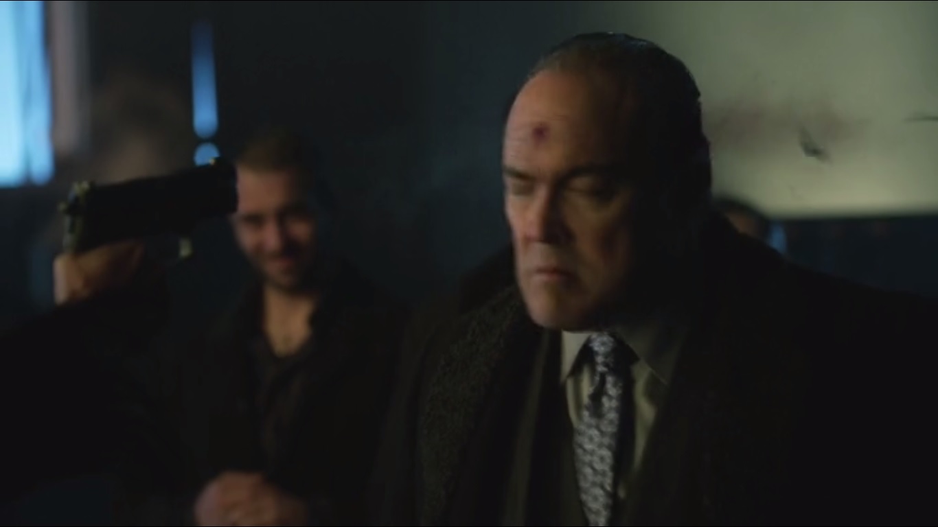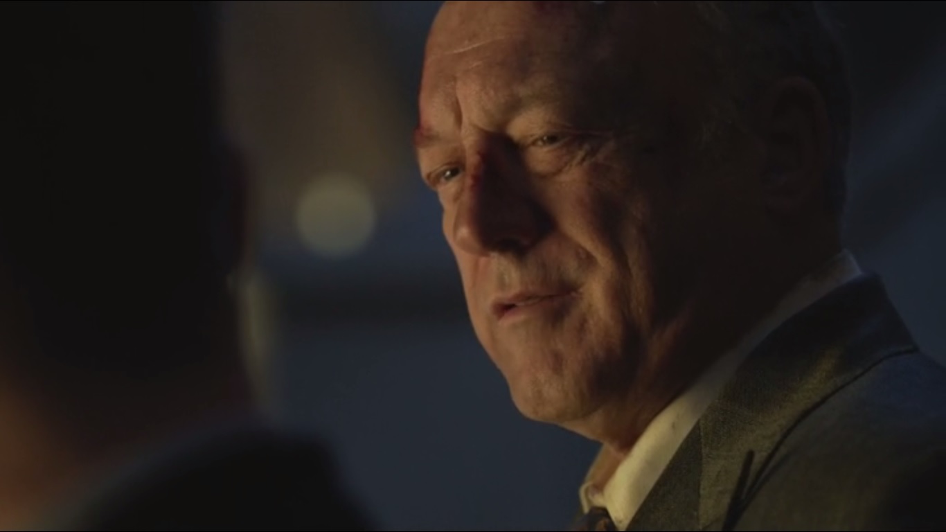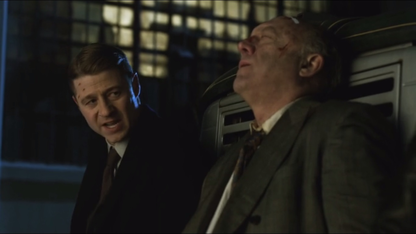 Jim takes a moment to answer a phone call from Bullock, who warns him to get out before others come to finish off Falcone. So Jim will have to get him out of the hospital. He agrees that Falcone is a bad man, but he’s the best bad man that they have. Maroni is too wild to run Gotham, and that would lead to anarchy. Falcone may have lost control, but he can get it back.