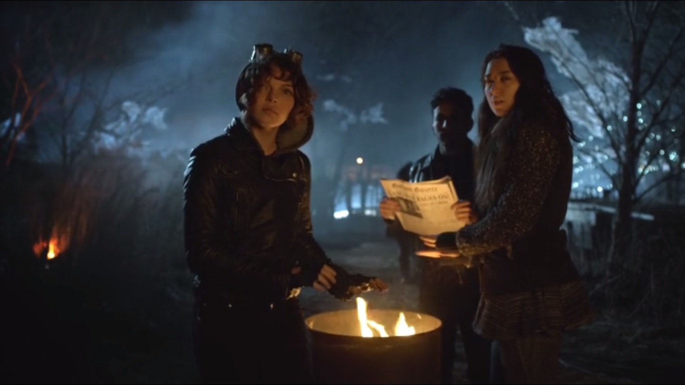 The episode begins on a dark night. Selina Kyle and some other kids huddle around a fire when Selina spots something in the distance.