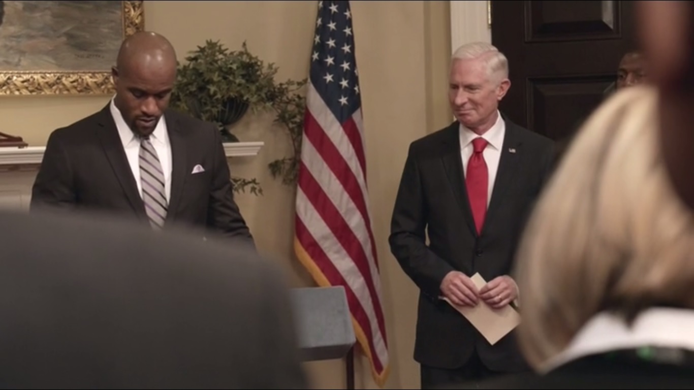 It’s time for the Rainbow Jersey event. Star Freddy Wallace, played by LaMonica Garrett, is proud to have the Vice President at his side. Who wouldn’t? Doyle gives the speech, though he has to alter it on the spot to avoid mentioning something that references Selina.