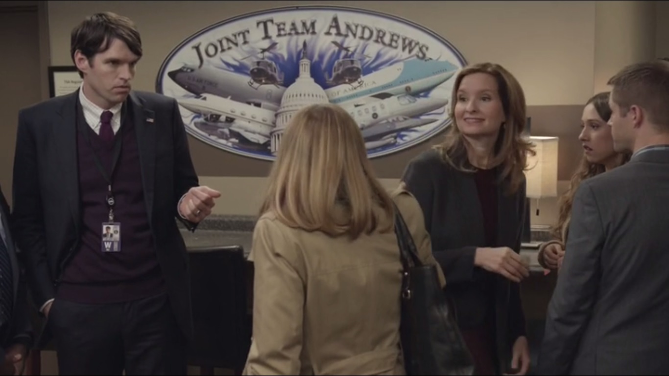 As Richard and Jonah head to Doyle’s office, Sue intercepts them and asks if they can get an autograph from Freddy Wallace for Sue’s son, who is also named Sue Wilson. Interesting. In the Vice President’s office, Doyle goes over Selina’s speech while the others go over the acronym LGBT. Jonah and Teddy have an interesting way of looking at it: L is for ladies who play tennis, G is for guys who do other guys, B is for bisexual- he couldn’t think of one to go for that – and T – is for tucking it in or tacking it on. Richard ruins the joke by pointing out that it’s transgender.