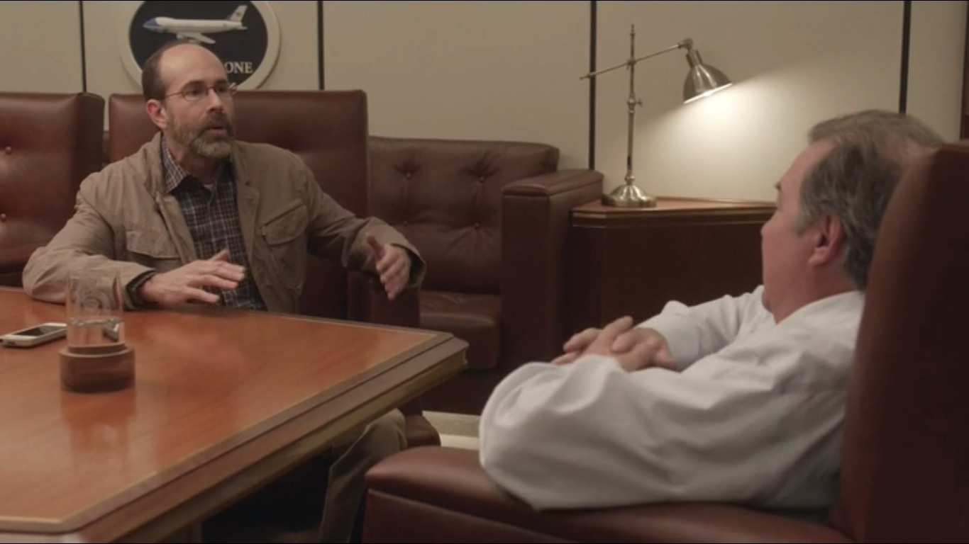 Mike and Gary arrive at the backup plane, but it’s broken. There’s actually a backup Air Force One. They need to get on the press plane, even though the press despises Mike. So the two decide to stock up on alcohol. That works for bribing, right?