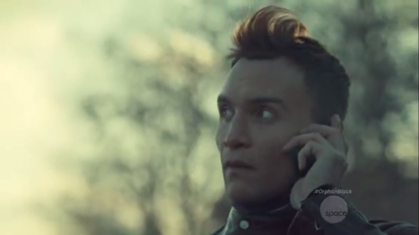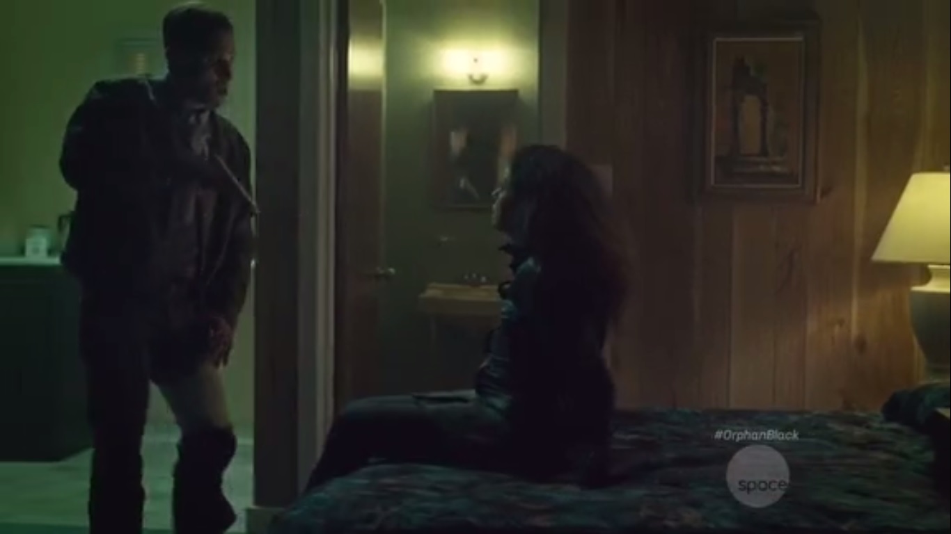 Felix interrupts Cosima’s conversation with Scott on synthetic sequence to discuss an important matter at hand: how Cosima is coping since her break-up with Delphine. It can’t be going well since she’s wearing a sweater that makes her look like she’s been mounted by a llama, has on expensive perfume, has pretentious French cigarettes, and even Eskimo pie. These are apparently signs of pining. Huh. Who knew? Though Cosima is expecting a call from Sarah, Felix wants her to come with him to Bobby’s for a drink.