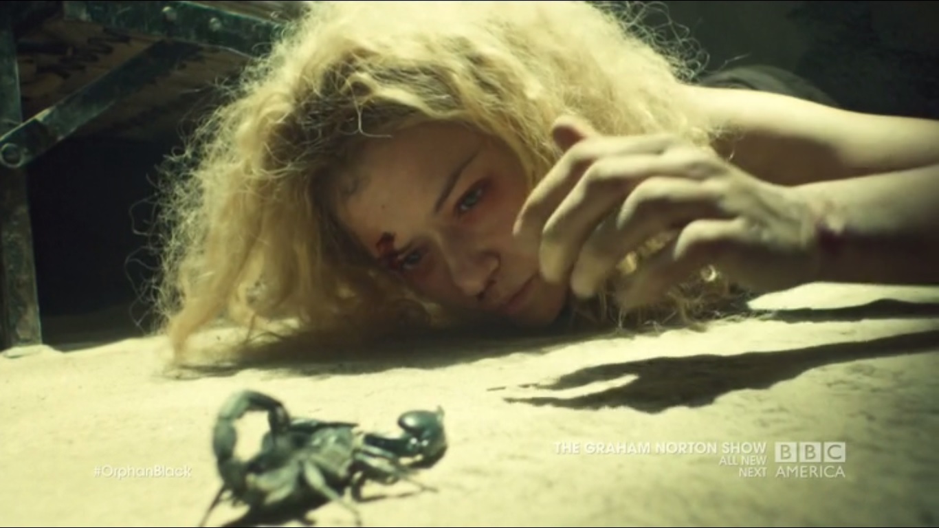 The episode begins with Helena’s favorite scorpion chiding her for killing Parsons. Soon, she’ll be suffering the same way Parsons did. Helena finds a tack in the sand and the scorpion crawls to another cell.