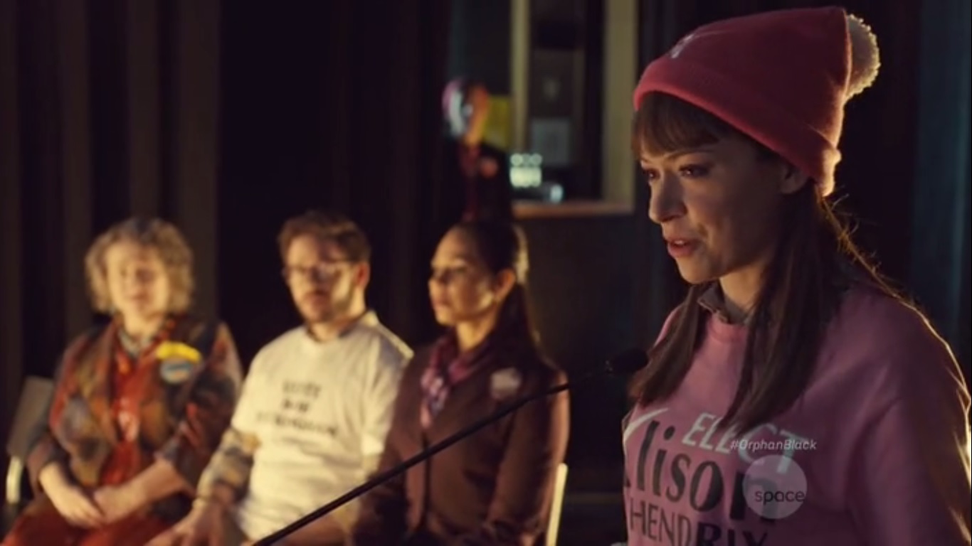 Speech time. Marci speaks about the importance of adjusting district boundaries, while Felix tells Cosima to hurry and memorize Alison’s speech. However, when Cosima takes the stage, she erupts into a coughing fit.