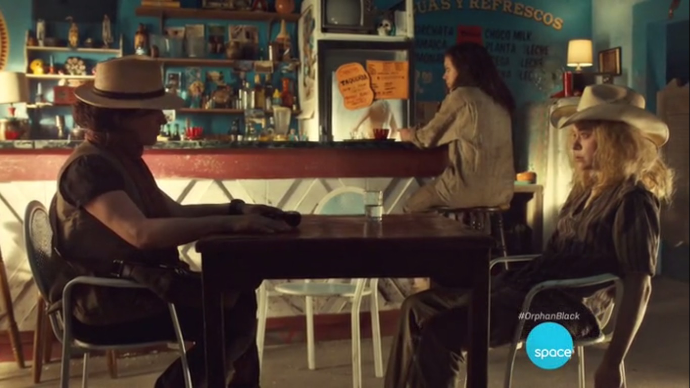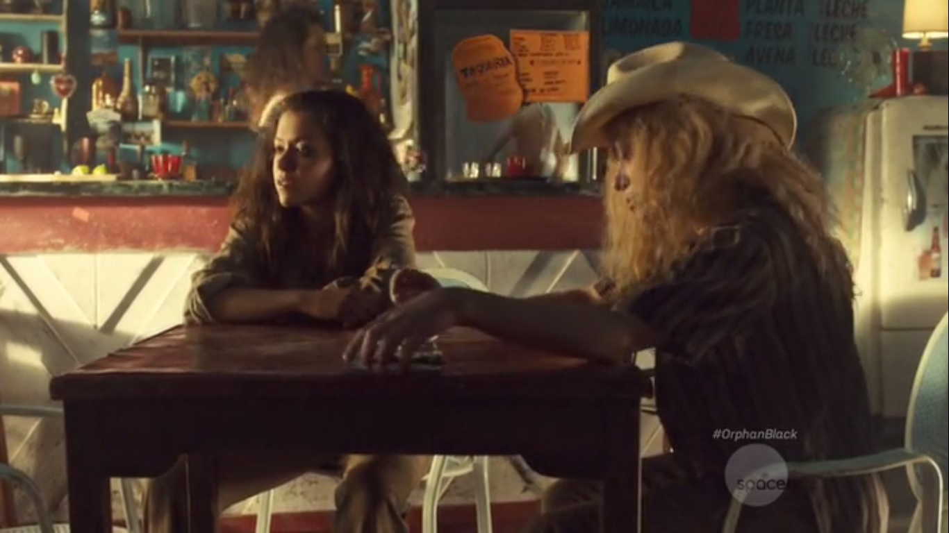 But then Mrs. S shows up. Helena rushes forward for the kill, but Sarah blocks her path. S attempts to appeal to Helena, telling her that yes, she did give her up so she could rescue Kira and Sarah from DYAD. Helena isn’t satisfied and still wants her revenge, but the bartender, Camarera, played by Michelle Arvizu, won’t be having any of that in her cantina. Camarera advises Sarah to go shower and wash off where she’s been. Where she goes next will be better.