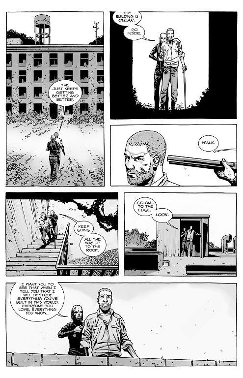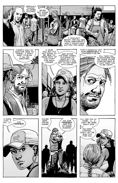Also, we get a brief appearance of Eugene and Rosita, who are still deep into their relationship, but all is not well. Remember that Eugene is not the father of this baby, but he vows to stay by Rosita’s side anyway. Again, I like how Eugene has more of a leadership role in the community, but he’s still fiercely devoted to Rosita. He even remarks in this issue that what she looks like doesn’t matter to him- he’ll still care for her.
