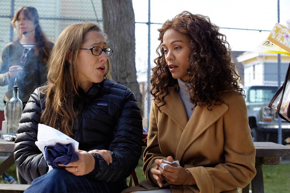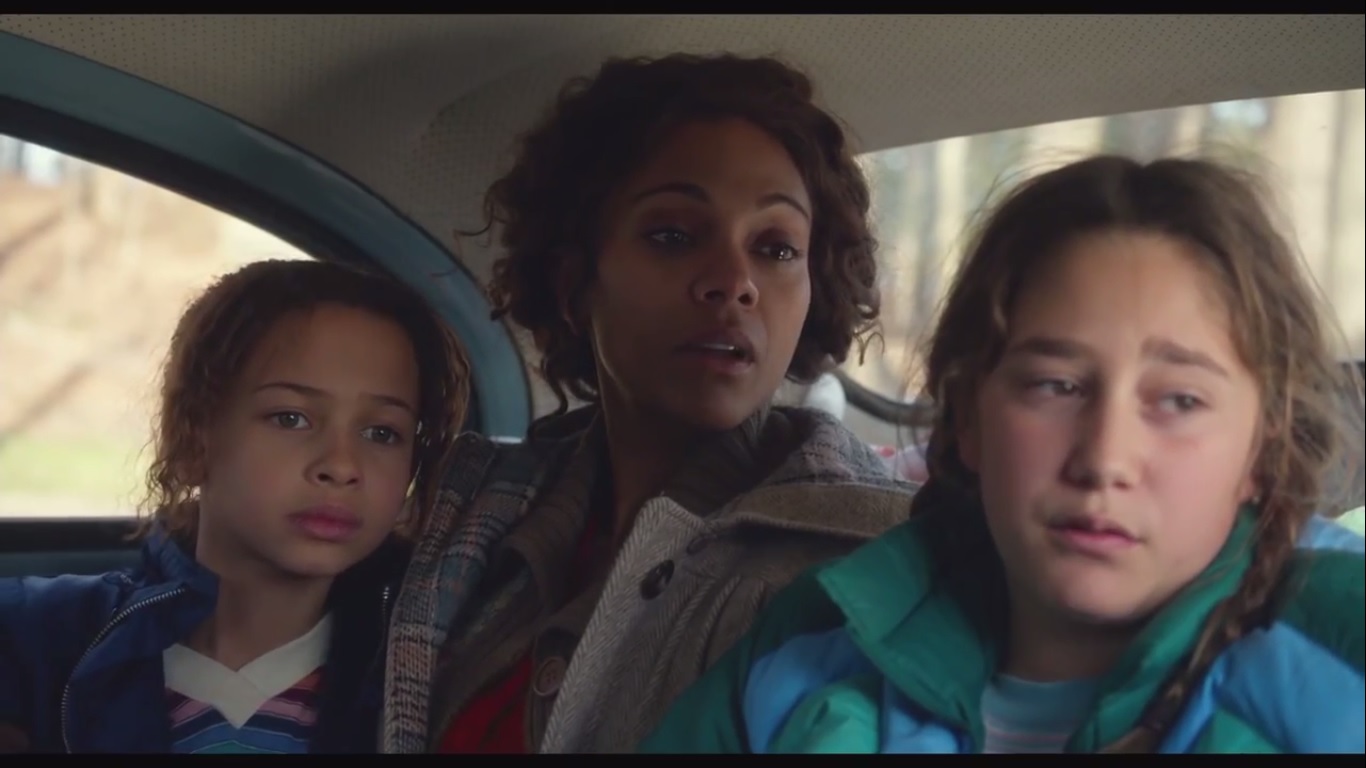 After spending a bit of time in the woods, the girls head back home. Waiting with the car to take the kids to school is Maggie Stuart, played by Gamora herself, Zoe Saldana.