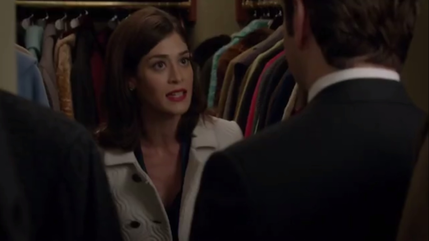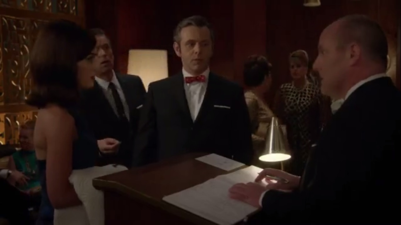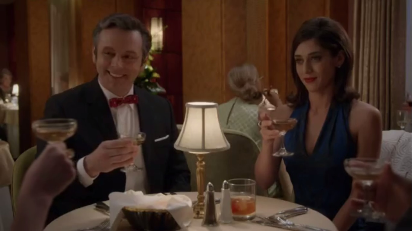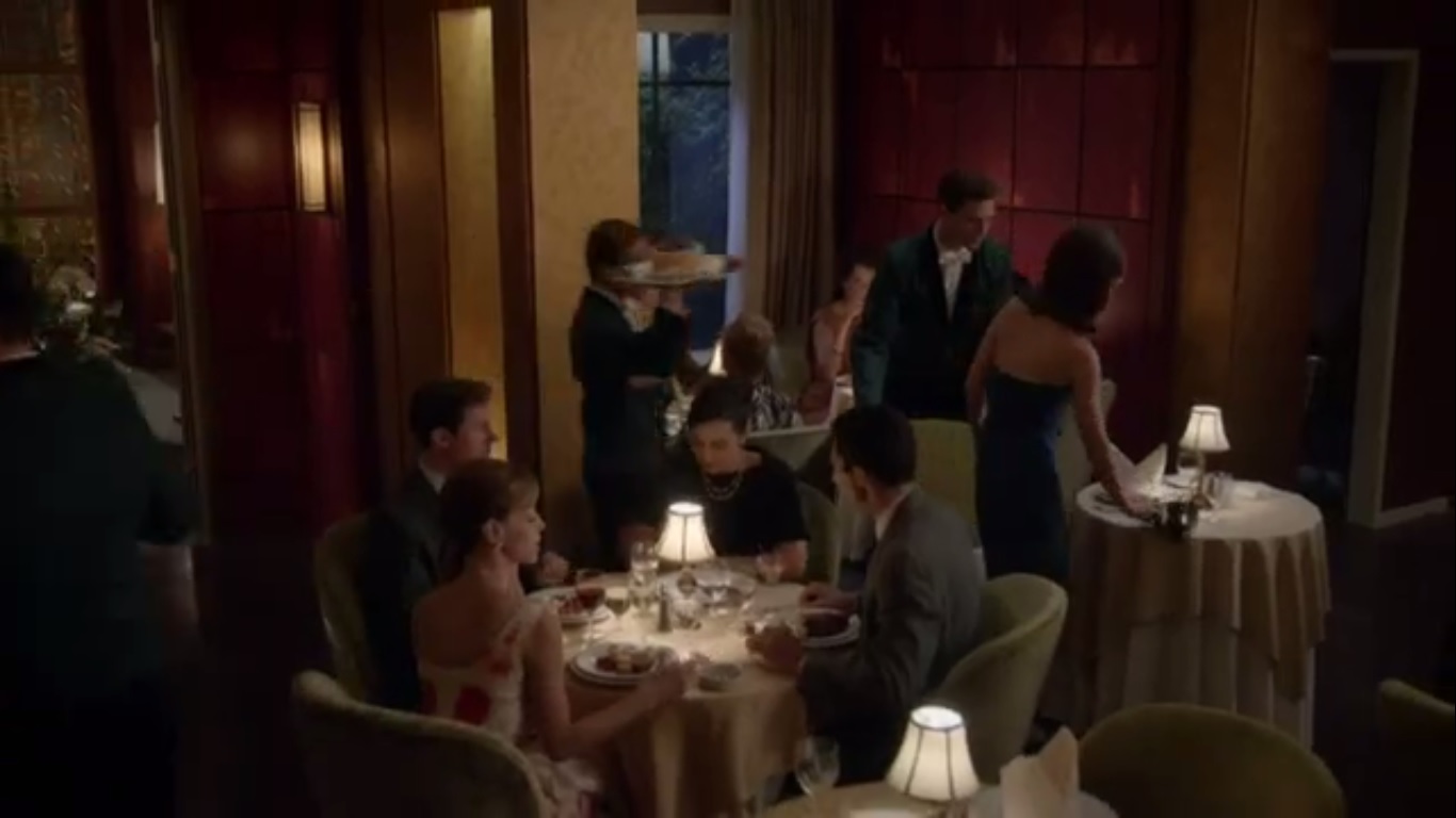 The episode begins with Bill and Virginia arriving at a fancy restaurant that, according to Betty, was given a four star rating by The New York Times. Indeed, very fancy. But it’s also hard to get a reservation. Bill feels that tonight is a time to celebrate, even though Virginia says that Bill monopolized their prior meeting. Bill checks his coat in to the clerk, Colette, played by Carly Waldman, but Virginia holds onto hers.