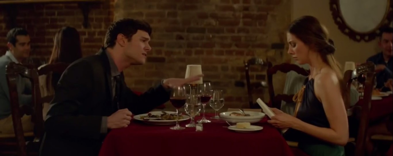 Lainey’s dinner with her date, Sam, played by Adam Brody, goes south fast. Sam is very talkative and into Lainey for honest reasons. He’s even talking about their possible future together. However, Lainey needs to present a letter to Sam and she’d prefer to read it aloud and uninterrupted. She mentions that, at the advice of a therapist, she’s been attending a program for…let’s call them love addicts.