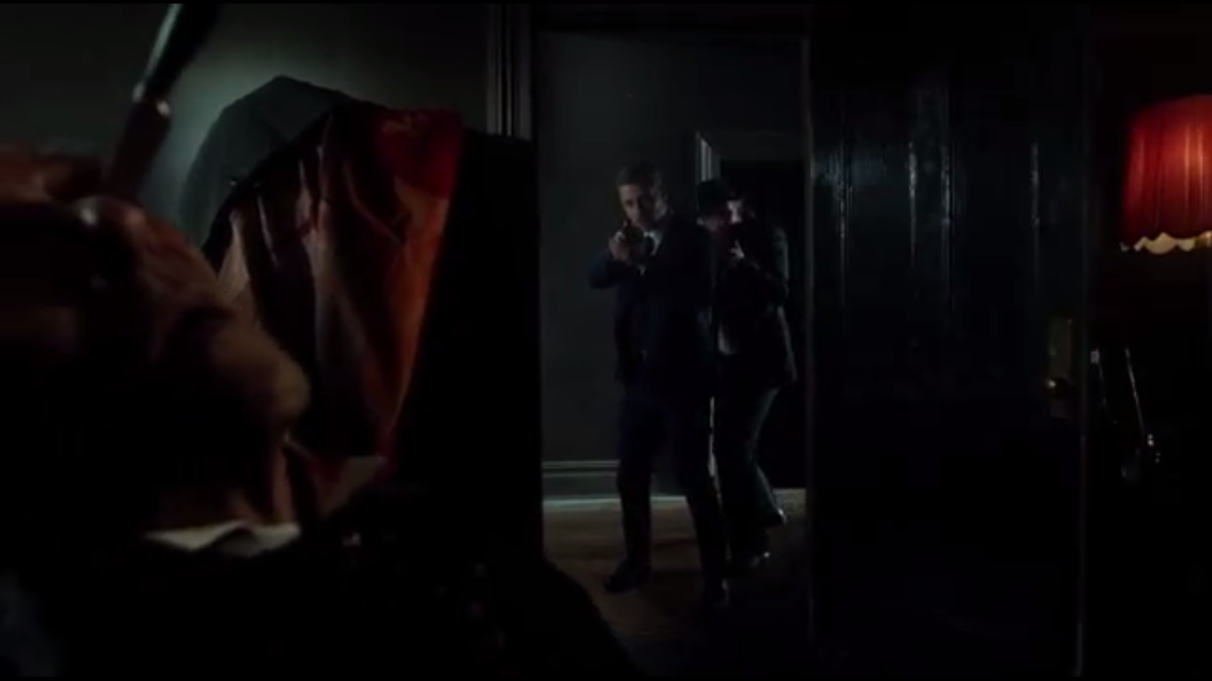 As Bruce heads out, he quickly arms and informs Alfred of what’s going on before being taken hostage by Jerome. But when Jerome sends a henchman to check, Jim emerges and shoots the henchman. Neither Alfred nor Jim have a clear shot of Jerome, so we’ve got ourselves a standoff.