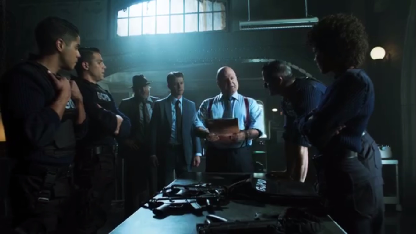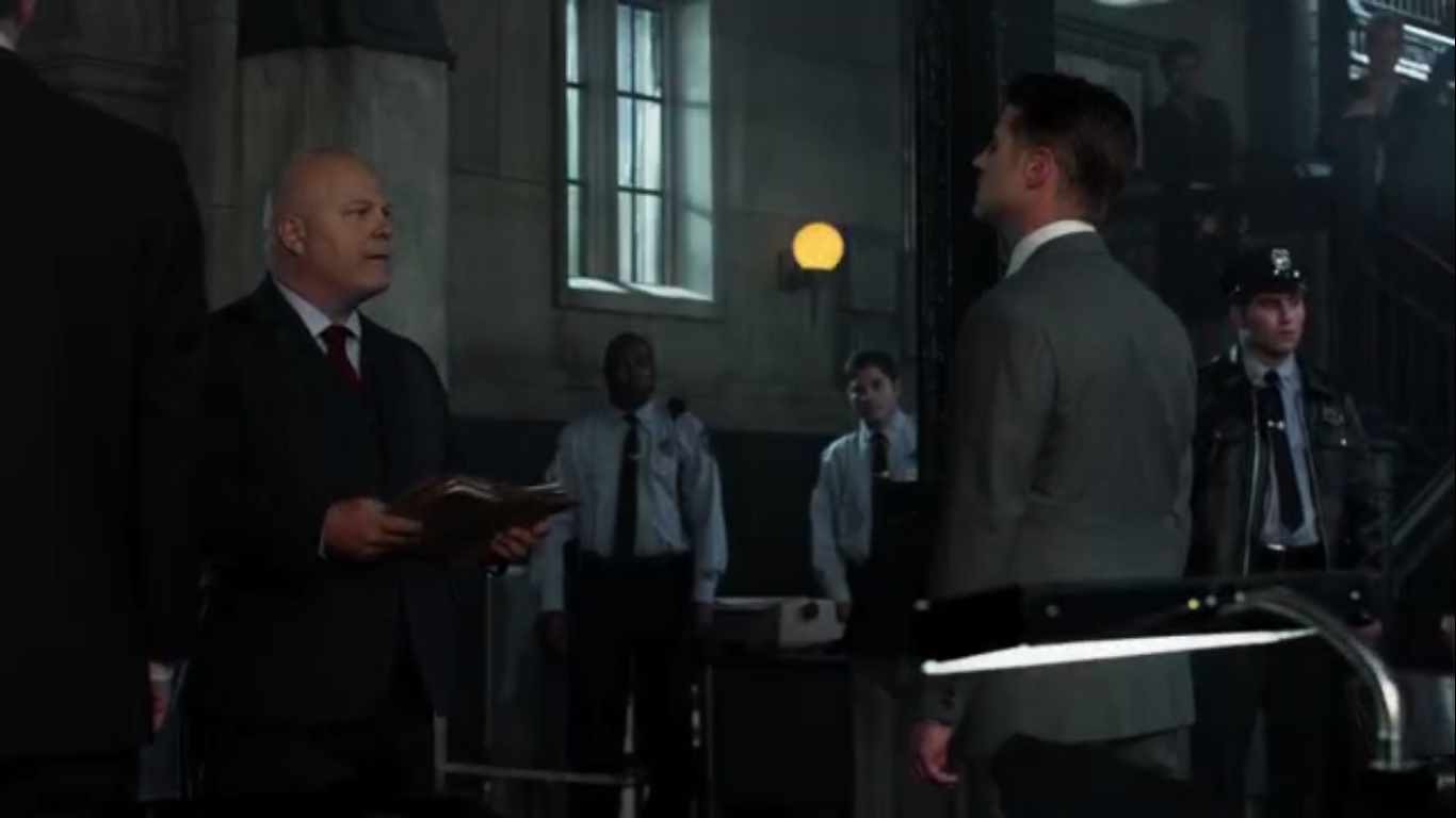 In private, Barnes asks Jim for his thoughts on his introduction. Jim agreed with every word. Barnes has read Jim’s file- he knows that he’s a troublemaker and fighter. Jim doesn’t deny this. So Barnes makes Jim his second-in-command to fix the department and bring law and order to the city. Though the GCPD is short on hands right now, Jim warns Barnes that this could be tough. Luckily, tough is what Barnes eats for breakfast. Yup. Barnes is a Jarhead.