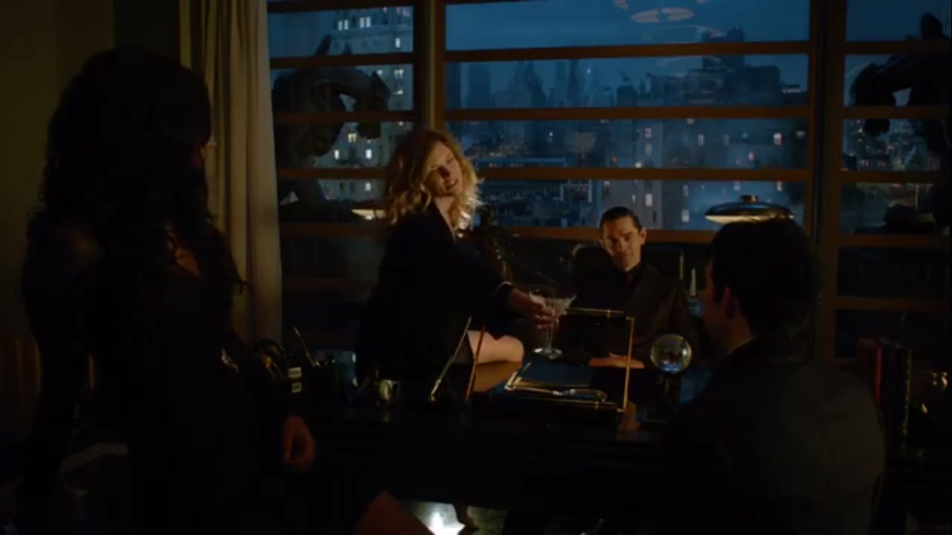 Theo watches a news report on potential new leadership candidates in Gotham City. But Mr. Galavan himself, who has not declared, has great support. Tabitha brings Penguin in- the name grew on him- to speak with Theo. Soon after, Barbara arrives to get more smooching just as Penguin figures it out- this entire plan was orchestrated by Theo himself. Barbara gives Penguin a drink.