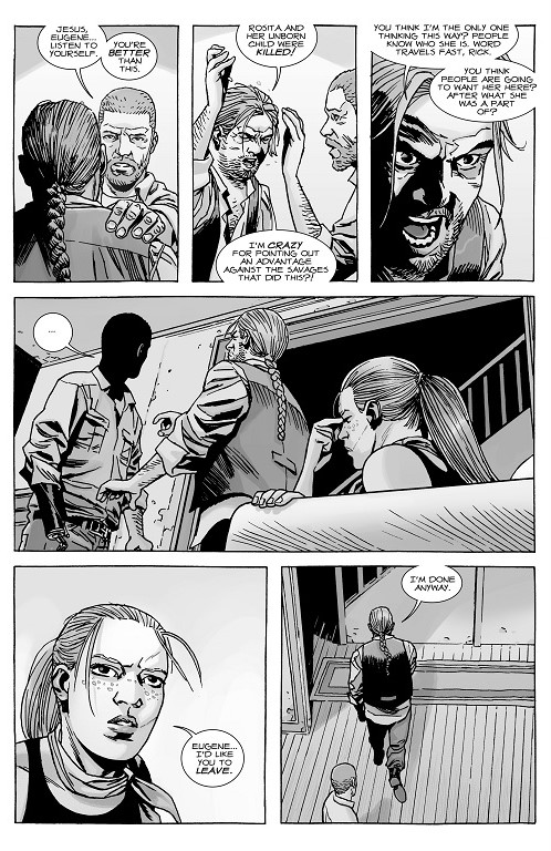 He has motivation: Rosita and her unborn child are dead. Sure, Eugene is a better man than he’s presenting at the moment, but he’s just lost someone important to him and he’ll never take care of the child that he knew wasn’t his. He’s less interested in calming down and more in just seeking vengeance.