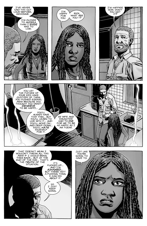 The talk between Rick and Michonne builds off of their conversation from #139 about finding and holding onto happiness in light of missed opportunities. With Ezekiel now dead, Michonne realizes now all the time she spent distancing herself could have been spent better getting to know Ezekiel. It’s a pain that will stay with her forever and she’s forced to live with it, but rather than dwell on it, she can choose to move forward and find new happiness.