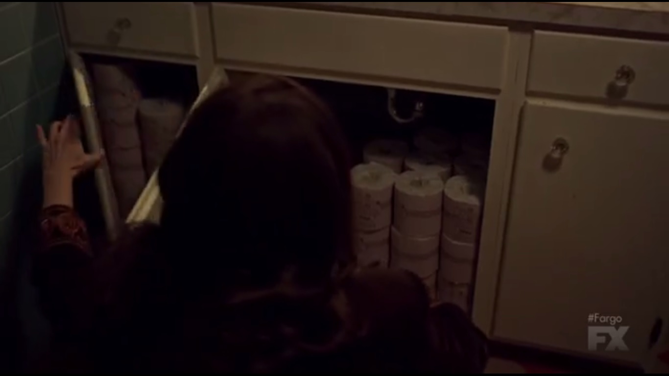 Peggy arrives at home. Constance decides to pop by the bathroom. As she washes her hands, though, she’s unable to find any paper towels. When she checks the cabinet, she finds rolls and rolls of toilet paper. What, does Peggy need that toilet paper?
