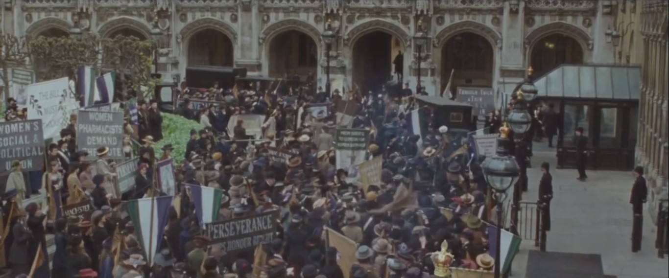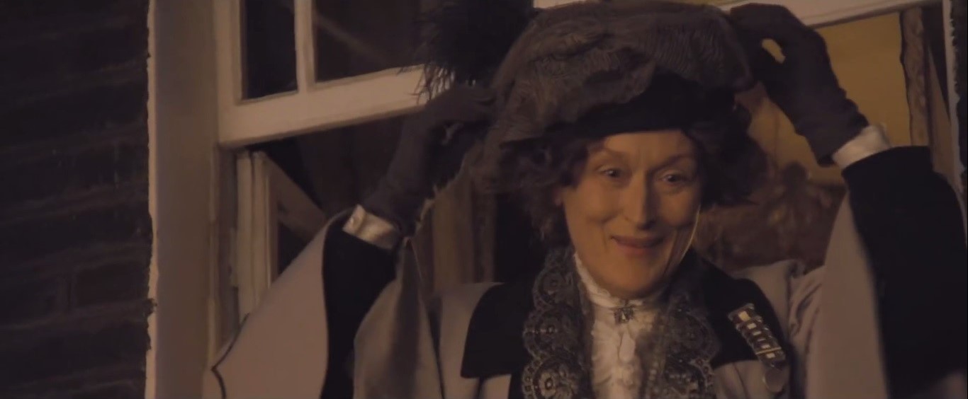 Indeed, Friday night approaches. Tons of women line the streets to hear the voice of their leader. Tensions are high as the officers wait for any opportunity to subdue her. With great fanfare and the support of many women behind her, the speaker and woman of the hour emerges: Emmeline Pankhurst, played by, who else, Meryl Streep.