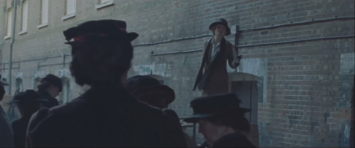 Inside, Maud initially prepares to deliver Violet’s words, but she drops the act and tells her story instead. She’s worked at the factory for many years, just as her mother did before her. The work is and always has been hard, and you don’t need schooling for this kind of repetitive manual labor. And in this line of work, as a woman, you’re sure to live a very short life. It also doesn’t help that women earn just 12 schillings to every man’s 19.