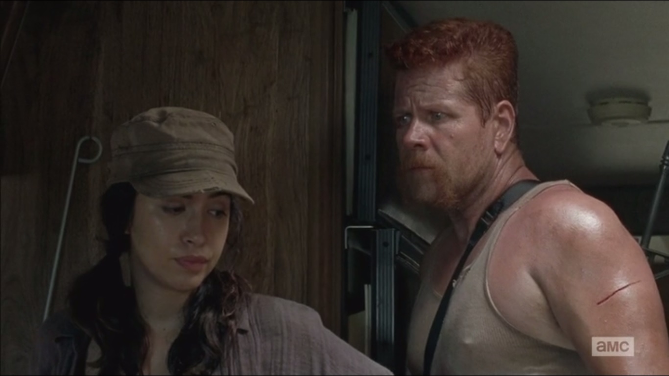 Abraham digs around while Sasha decides to take a temporary siesta. But Abraham is itching to kill the remaining walker in his new, temporary home. So he wants to give the walker a name. Sasha calls this his fault. She was going slow until he jumped in. Abraham says that Sasha was out of control earlier, though both now claim to be in control. But is that why Abraham wanted to kill the walker? No, it’s because loose ends make his ass itch. If he’s not guiding his psyche, it’s because shit hits the fan without respite.