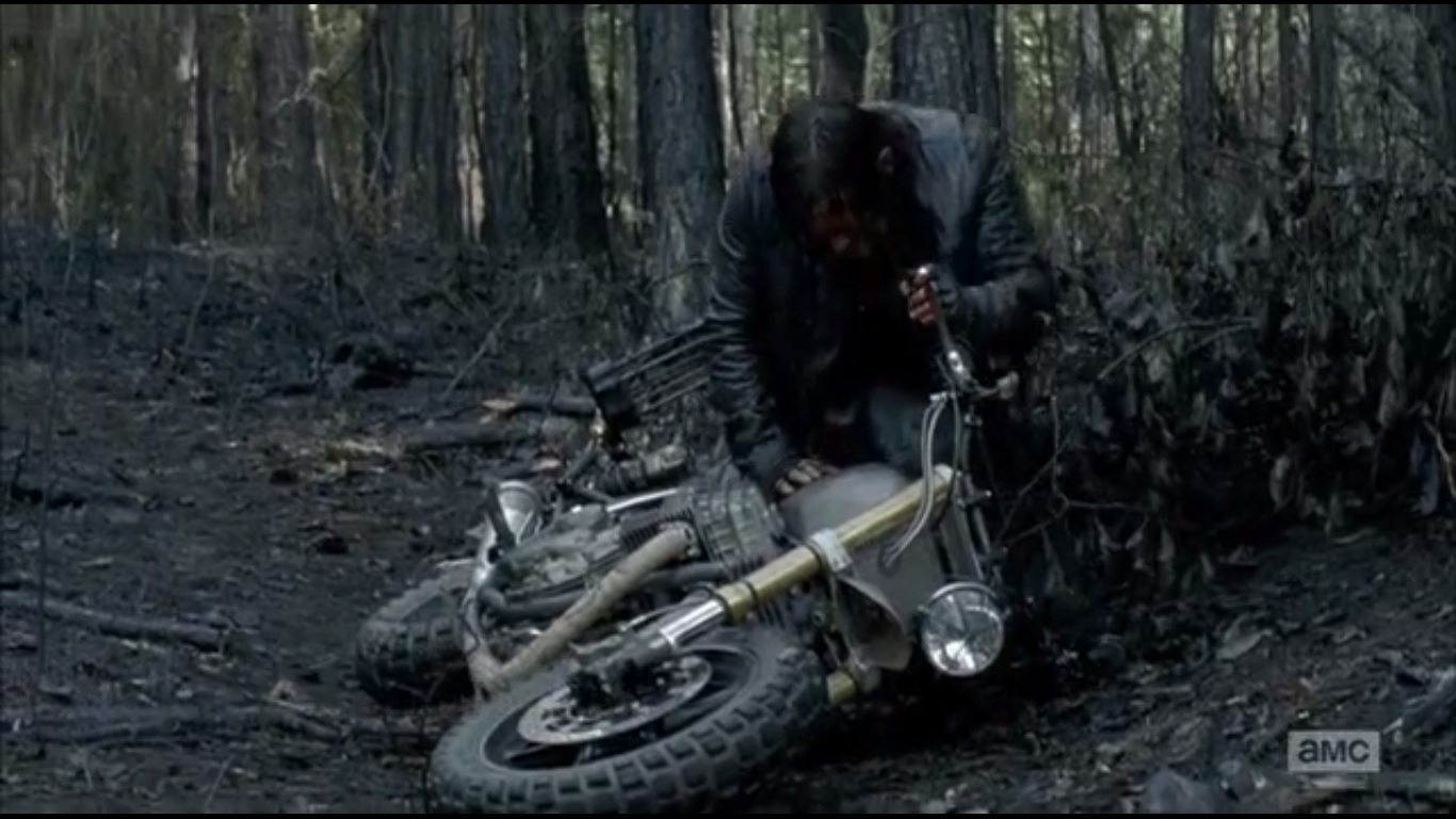 Daryl takes cover in the woods, having evaded his pursuers for the moment. He soon falls off of his motorcycle, but finds a charred and helmet wearing corpse on the ground beside him. Well, that’s unexpected. He soon continues his journey, passing other charred corpses along the way. As Daryl is forced to push his motorcycle, it weighs him down. He radios to Sasha and Abraham, but just gets static.