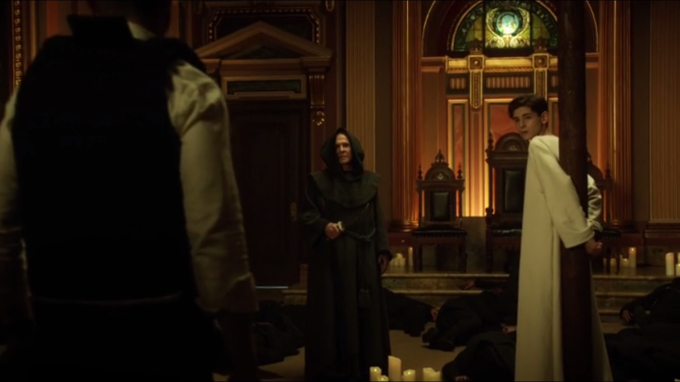 Bruce is set to be sacrificed as Theo hands the blade over to Father Creel. He silences the followers and approaches young Wayne, telling him to prepare himself. Bruce, in response, calls him a deluded old fool. Before he can strike, Silver yells for this to stop. And this distraction is enough to give Jim and his men an opportunity to enter and start a firefight.