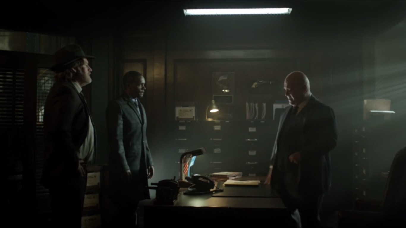 At GCPD, Lucius Fox wonders whether Alfred and Bruce have been abducted, but missing persons can’t be reported until 24 hours have passed. Even still, Barnes puts in a call out of respect for Wayne Enterprises. The obvious suspect is Theo Galavan, but Fox has no proof that he abducted anyone. It’s just obvious, but to get a warrant, GCPD need proof. Barnes then gets a phone call.