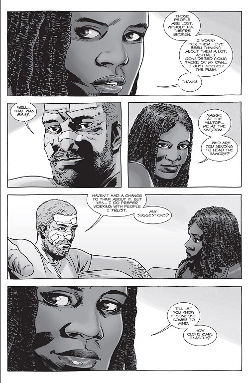 We also finally get to spend a bit of time with Father Gabriel, who hasn’t had much to do since the time-skip. Yeah, we’ve seen him here and there, but this is the most, if any, dialogue he’s had. And it’s about him wanting to step up, which I like. Gabriel isn’t a character we’d assume would normally be out killing roamers, but he did step up during “All Out War” and he realizes that it’s time he did more than just work to save people’s souls. Good on him.