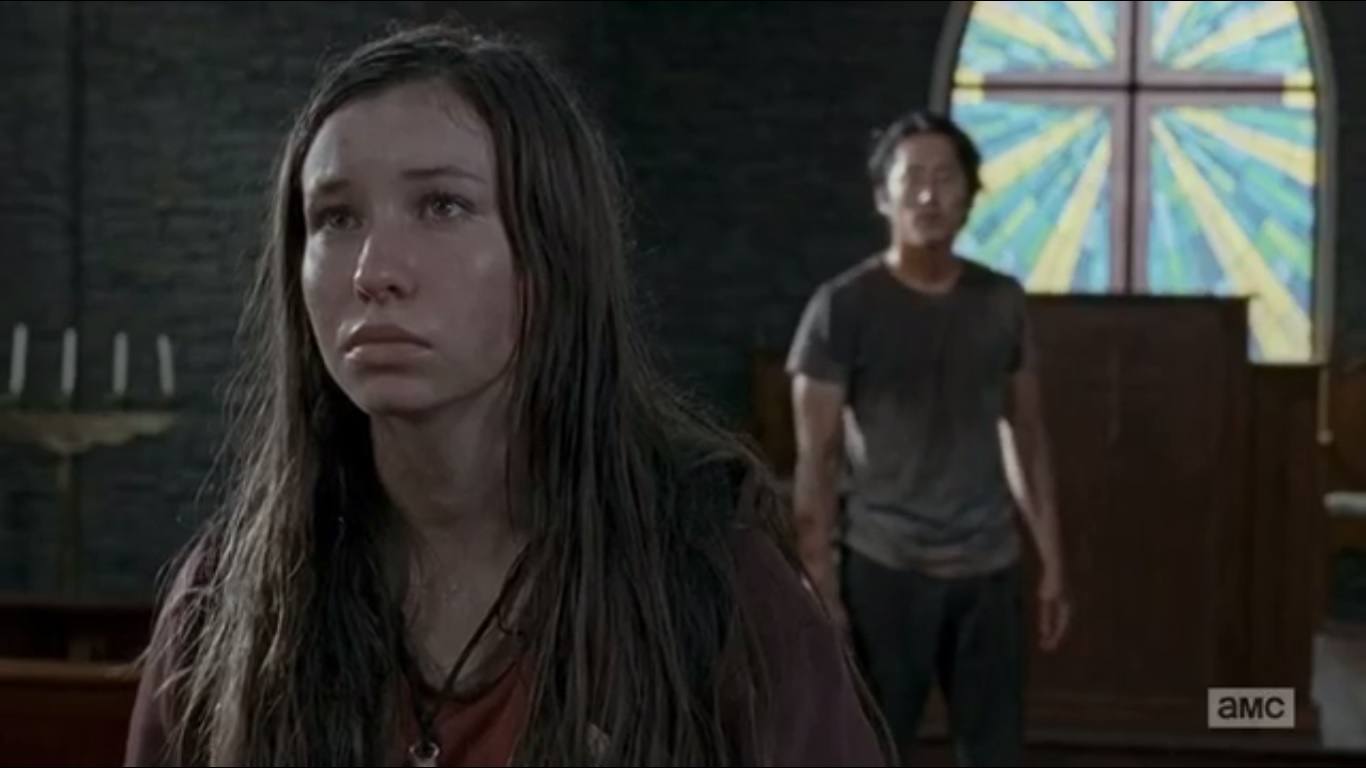Outside the walls, Glenn and Enid arrive in the church and search for weapons or anything they can use to climb to the other side or at least start a fire. Churches typically tend to have things like that. Enid says that when she wanted to run, Glenn said that’s how you lose people. Even after they’re gone. What the hell does that mean? Glenn says that people you love make you who you are. They’re still a part of you. If you stop being you, that last bit of them inside of you is gone.