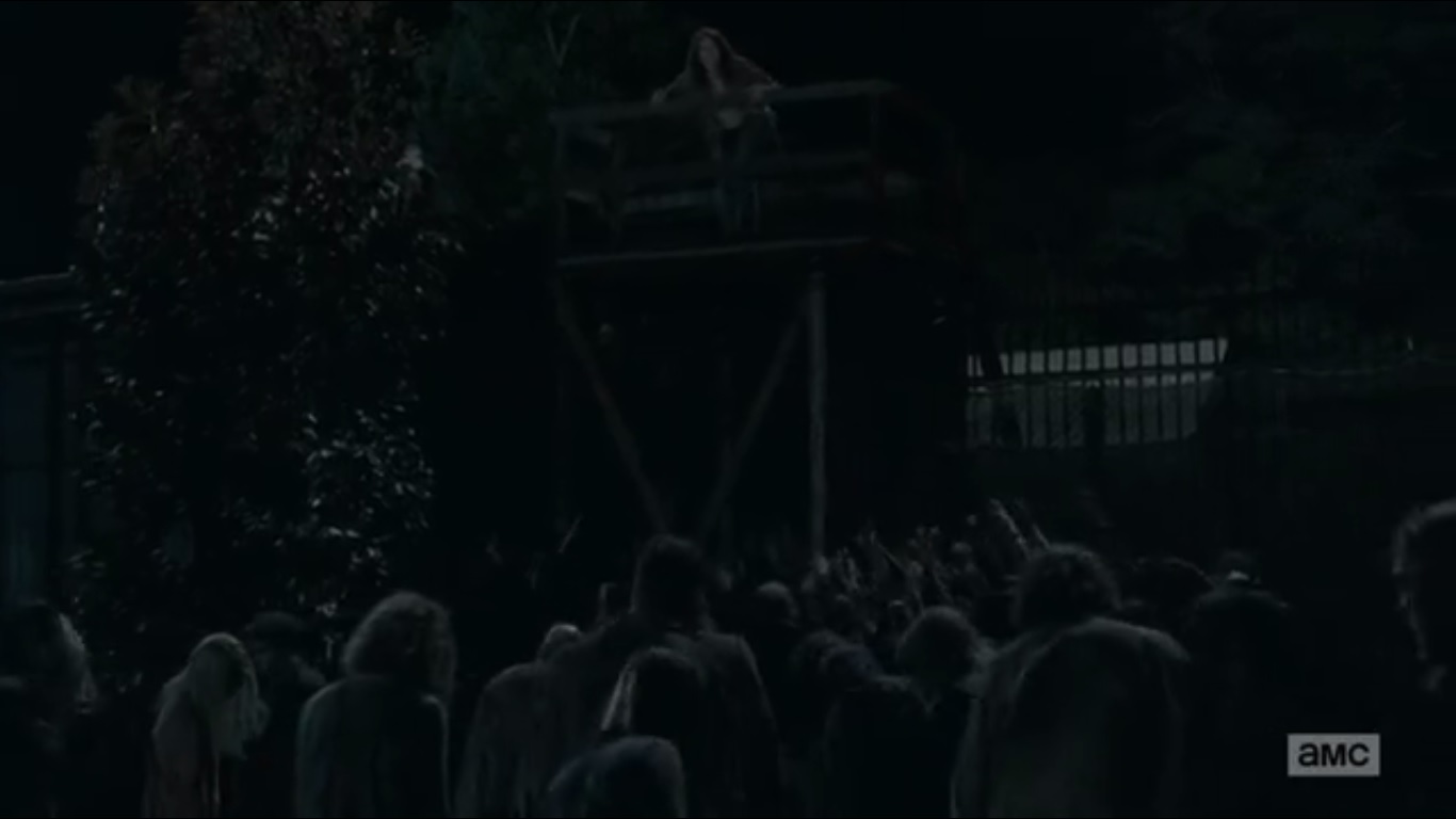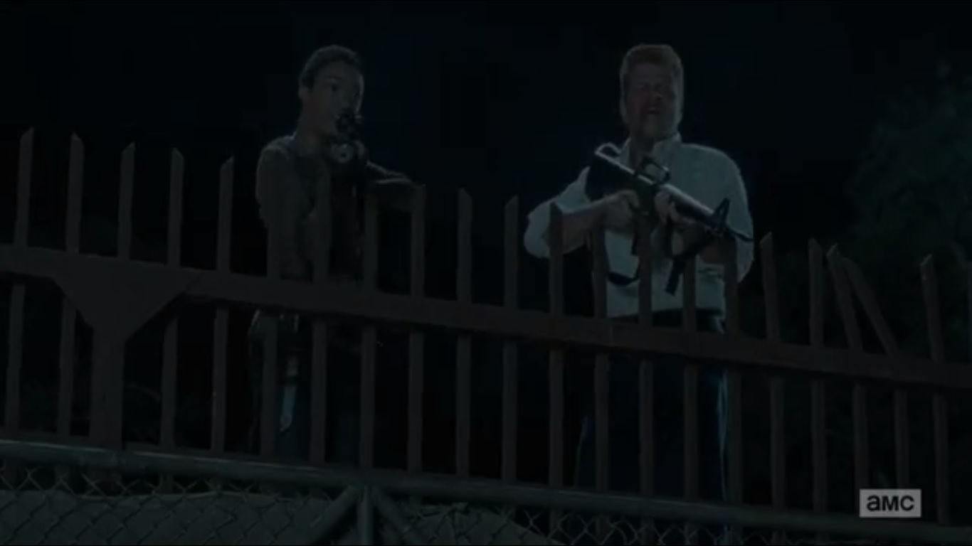 Enid and Glenn- remember them?- find Maggie still atop the watchtower that’s on the verge of collapsing. Glenn begins to draw walkers away while Enid scales the tower to help Maggie, who is surprised to see Glenn alive. Glenn insists that Maggie escape, and not like Maggie can help- she’s out of bullets. He once again finds himself surrounded by walkers, and while he’s survived worse, he receives some help from the cavalry.