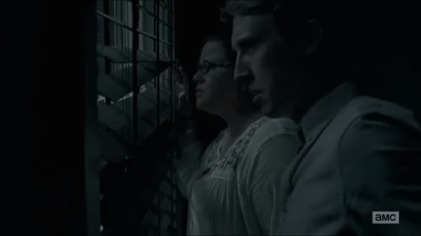 To Glenn, those people are his parents, Maggie’s father, a woman named Andrea, Tyreese, a man named Dale…but who are they to Enid? Her parents. And they’re still here, Glenn says. He tells Enid to stay put, but she’s here now and will still help him save Maggie. She says she can climb up the gate while he distracts the walkers. After all, she’ll just follow him anyway. Enid plans to make something Maggie can use to climb down.