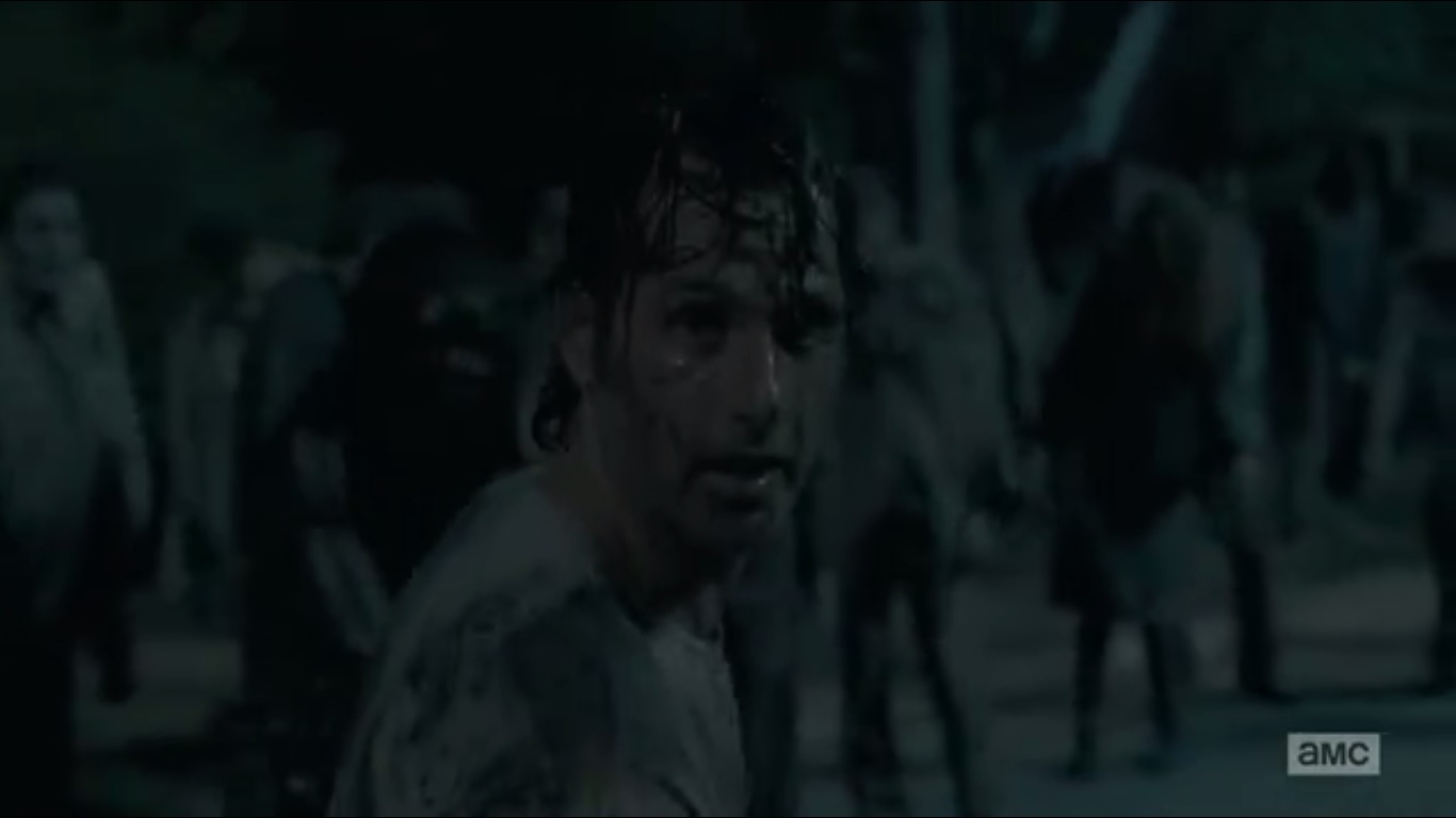 Night falls as Rick and the others continue making their way through the herd. Sam picks the wrong moment to remember Carol’s chilling words to him as he breaks the chain. Denise and Ron try to encourage him to be strong and that’s when the walkers take him. However, he’s still holding tight to Jessie’s hands as she also screams out in horror.