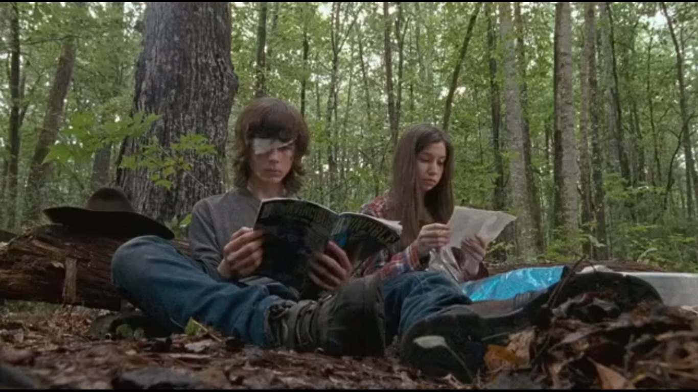 So what else do kids do? They read comic books and eat snacks, as Enid and Carl do. Well, Carl is reading a comic. Enid is still trying to make something out of her map. The two hear a noise that turns out to just be Spencer and Michonne on their separate walk. Carl returns to his comic book while Enid says that she doesn’t want to come outside of the walls anymore. The two then leave.