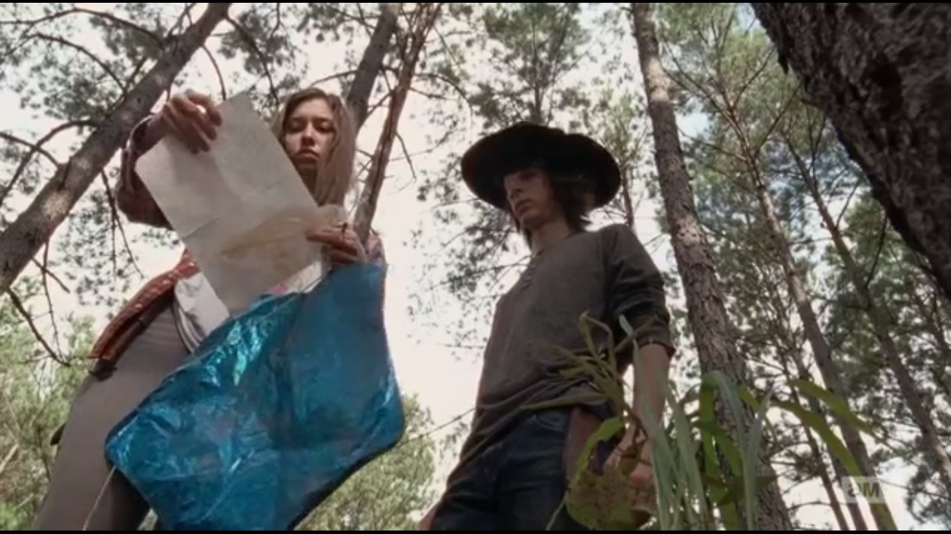 Elsewhere in the woods, Enid shows Carl a wet map that’s of little use now, so the two keep walking. Enid figures the map is still useful and shows that they’re not alone. So why are the two out there? Well, because they’re kids, but Enid doesn’t seem as enthused as Carl.