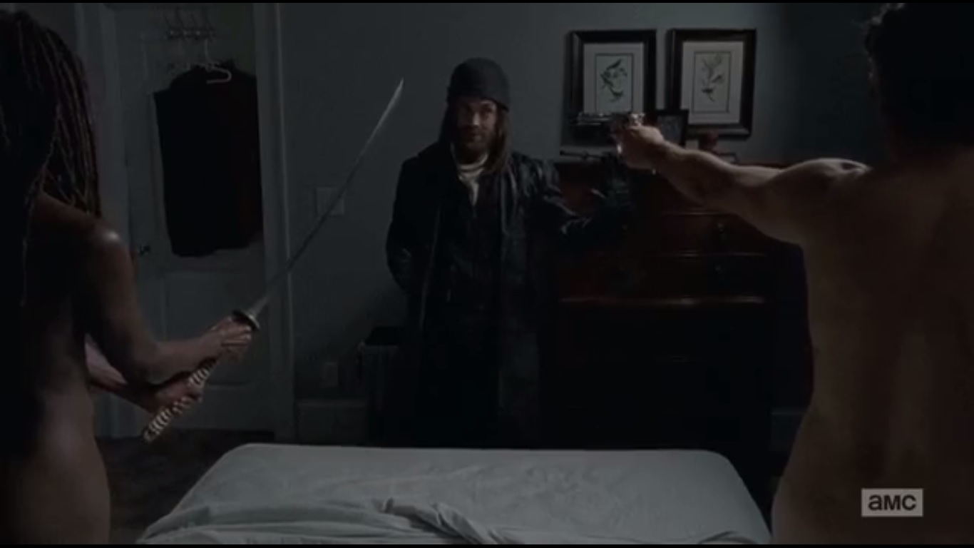 Next morning, Jesus wakes up a nude Rick and Michonne to talk. How rude. Though it’s cool that Rick and Michonne sleep with their weapons right next to them.