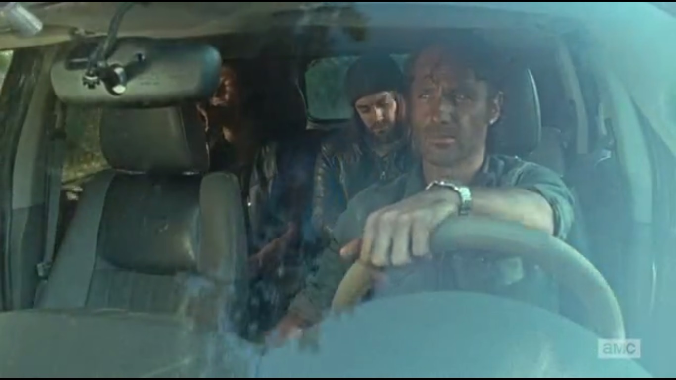 Now in a new vehicle, Rick, Daryl, and a restrained Jesus head back to Alexandria. Daryl says that he would have left Jesus, but Rick disagrees. He’s finally listening to what everyone told him.