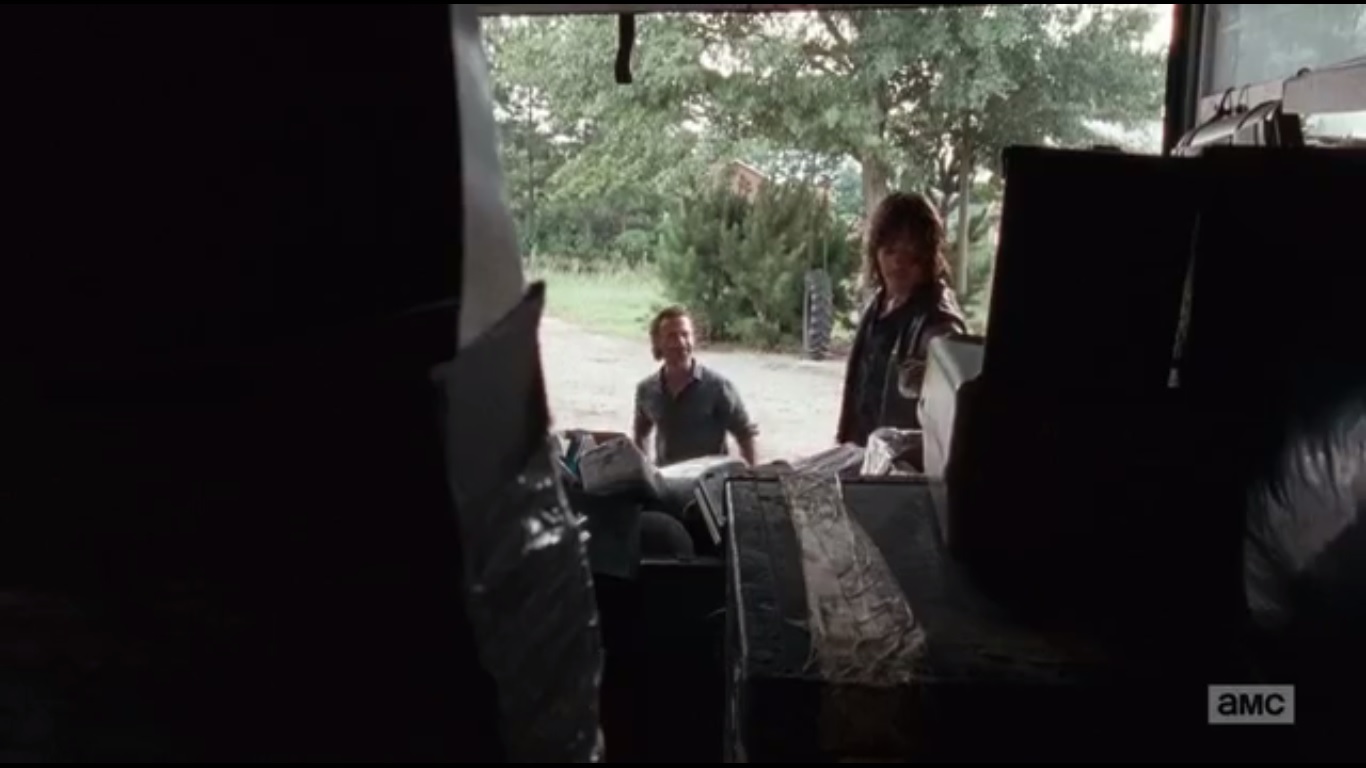 Eugene then gives Daryl and Rick a list of agricultural supplies to help with the food situation. Daryl and Rick then leave the Safe Zone to do everyone’s shopping. On the road, Rick says that this is the day for them to catch up and maybe find more people. He then inserts a CD, against Daryl’s wishes, as it draws walkers away from home. Fair enough, but still a dick move.