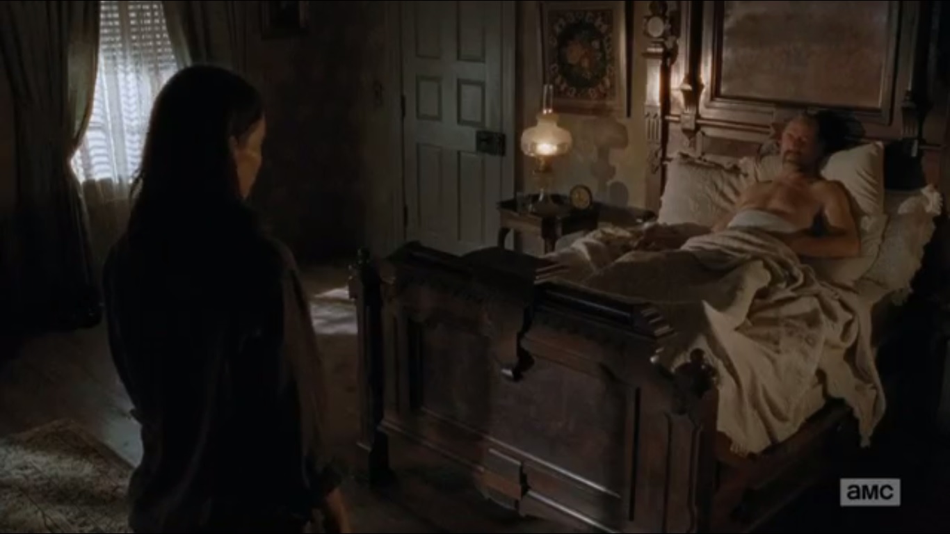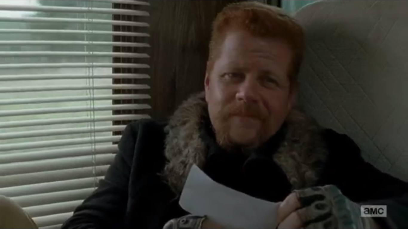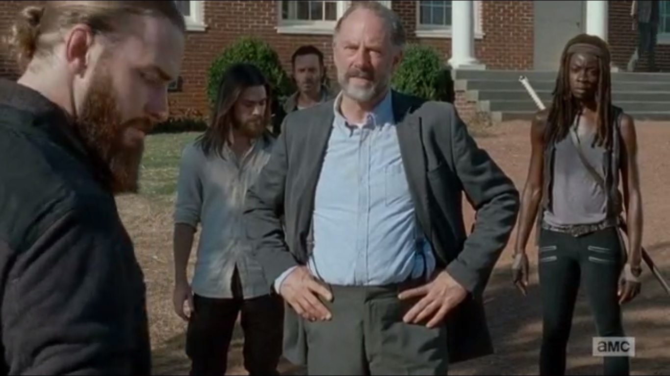 Gregory isn’t good at confrontation. Jesus wouldn’t have picked him as leader, but people like him. Gregory agreed that half of the community’s supplies would go to the Saviors in exchange for them not attacking the Hilltop. Daryl and Abraham, familiar with the name Negan, explain that they met and took care of some Saviors. They offer to help take down this Negan fellow in exchange for food, medicine, and one of them cows, as Daryl puts it.
