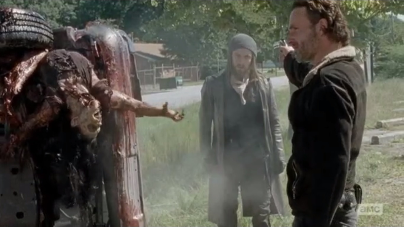 Trust Rick Grimes and company to escalate a fight. Yes, that was started by Ethan, but only Rick could show up in new territory and end up covered in blood on the first day. That’s how you make an impression. Not a good one, mind you, but people will remember that. And Andrew Lincoln’s delivery of that nonchalant “What?” after killing Ethan was great.