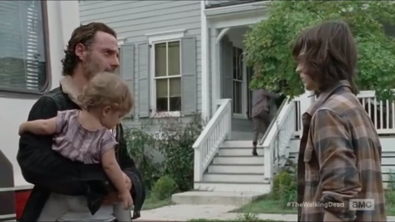 Denise gives Daryl a homemade oatcake, even though he’s likely to just pick up something on the road. Literally. He eventually takes it, as he reminds Denise of someone she knew. Rick tells Carl that he isn’t sure, but if Jesus is being honest, this could be the start of everything. He explains that he and Michonne just happened last night, and Carl is cool with that. Carl doesn’t want to come on the trip, though, since someone should stay back to keep the place safe.