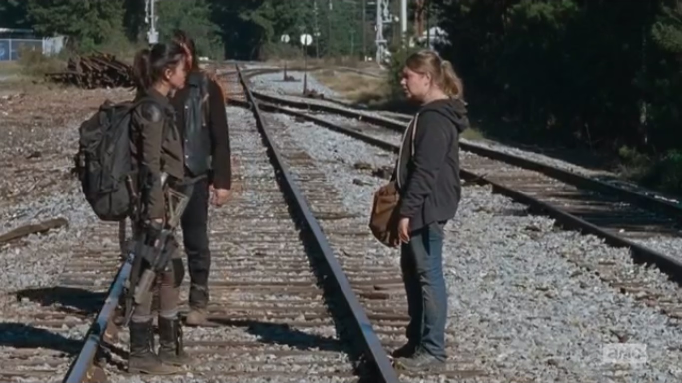 On the road, Denise gives Daryl front seat tips about driving stick when the three eventually reach a fallen tree in the road. Daryl and Rosita head out and begin removing the debris while Denise watches from the safety of the truck. The three go on foot, with Daryl and Denise going through the woods while Rosita follows the train tracks. Given the group’s history with train tracks, I’m not against Daryl’s decision to follow the road.