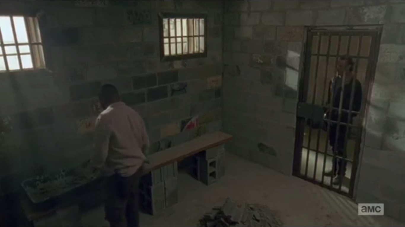 The episode begins in what could be a tribute to Groundhog Day in Alexandria as the citizens go about their daily routines. Morgan is putting the finishing touches on his jail cell when Rick arrives and asks Morgan why. Morgan responds that it will give the citizens some choices for next time. As Meredith takes inventory, we go about another daily routine. Carol still has the crucifix from the previous episode, even. Rosita heads out, leaving Spencer in bed.