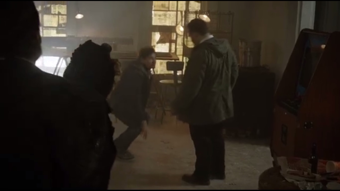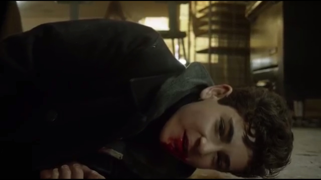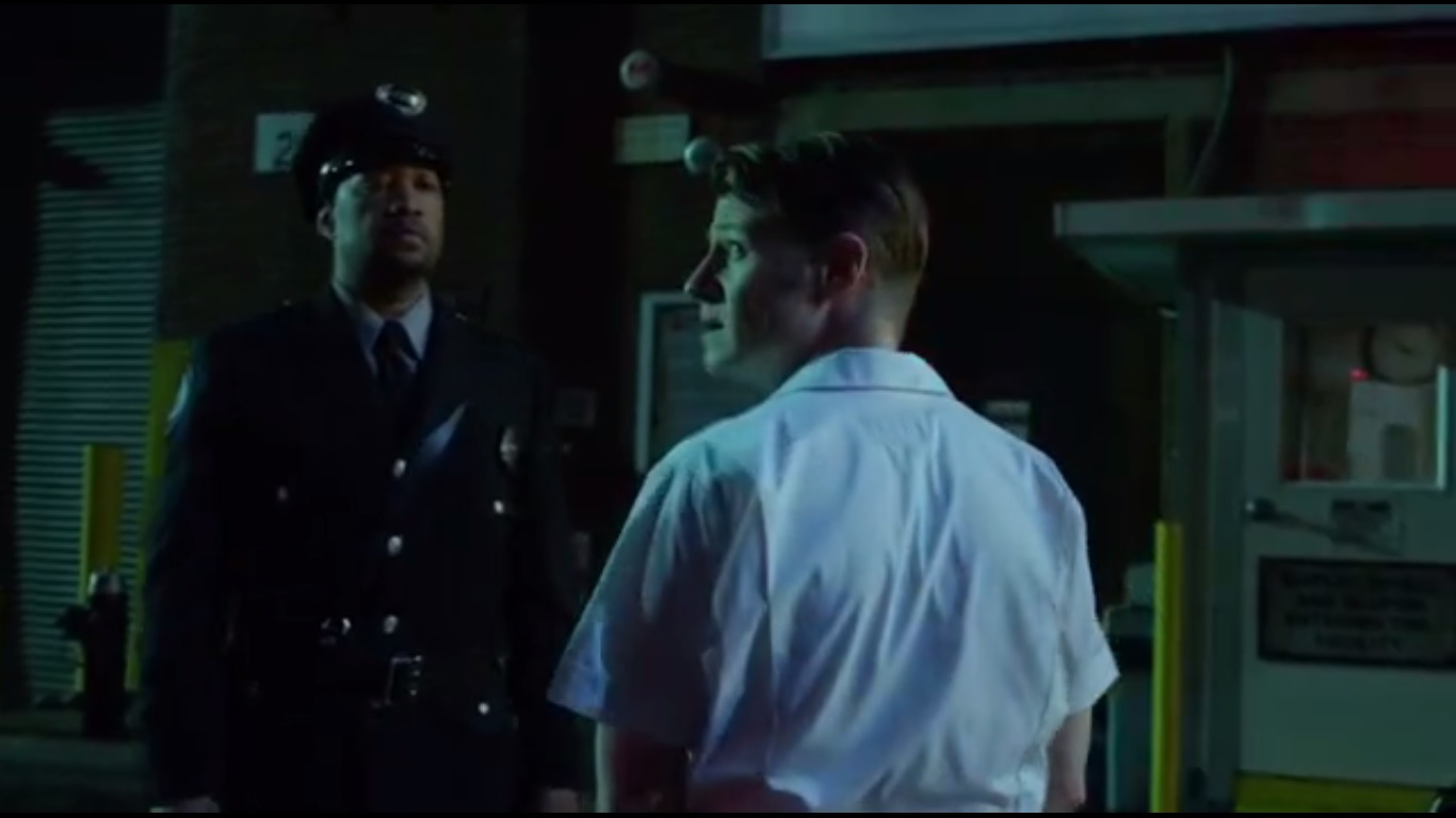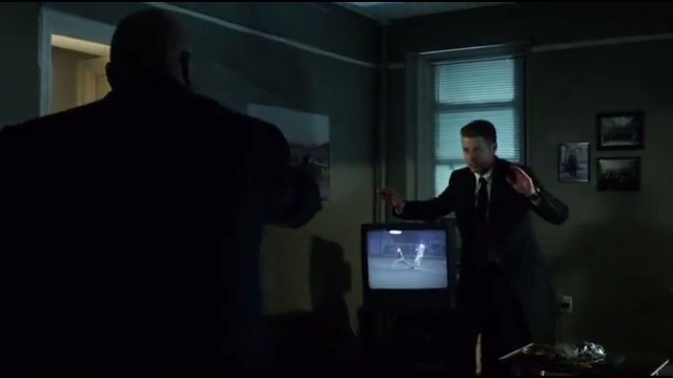 So Gordon investigates said pay phone, but ends up entering a nearby room where he finds Pinkney’s body. But then he spots Barnes entering and the two wonder why the other is present. Barnes orders Jim to put his gun on the floor. Jim does, but he explains that he was following up a lead on the bomber investigation.