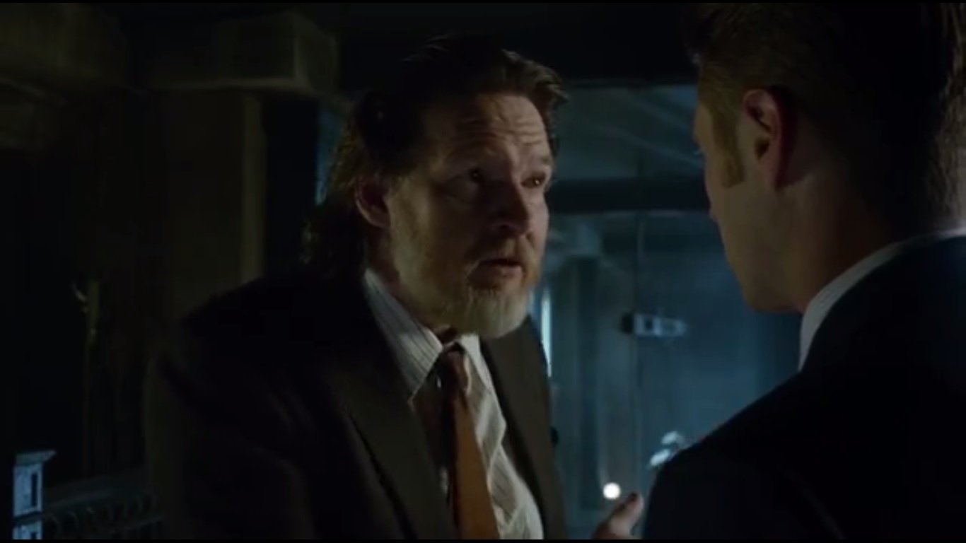 And Barnes is still suspicious of what happened with Galavan and Gordon that night. And now, the one person about to shine a light on this is found dead with Gordon standing over his body. Jim calls this a setup, but Barnes doesn’t buy it. The least Jim could do is admit what he did. Barnes still wants to believe that Jim is a good cop, but Jim wants to talk to his rep. Barnes, now heartbroken, calls Jim a disgrace to the badge and has him hauled off to county.