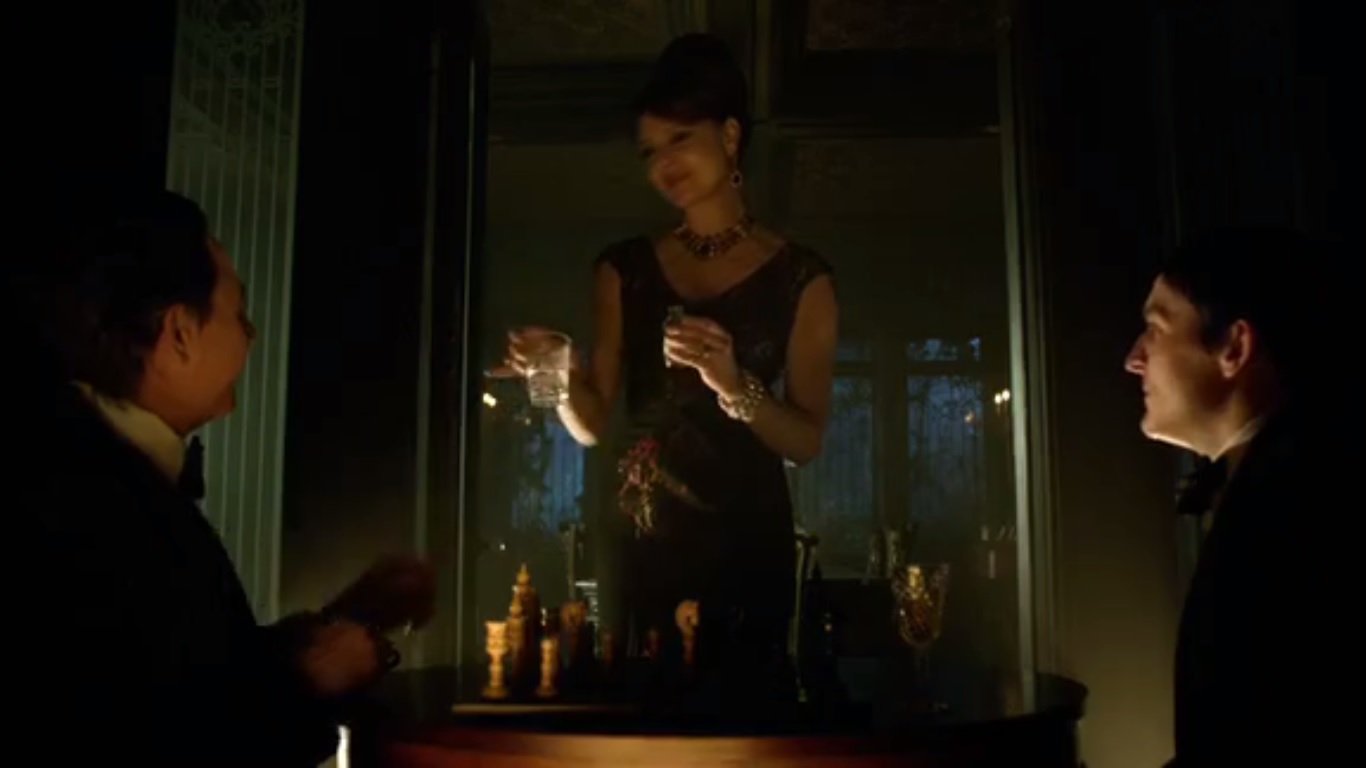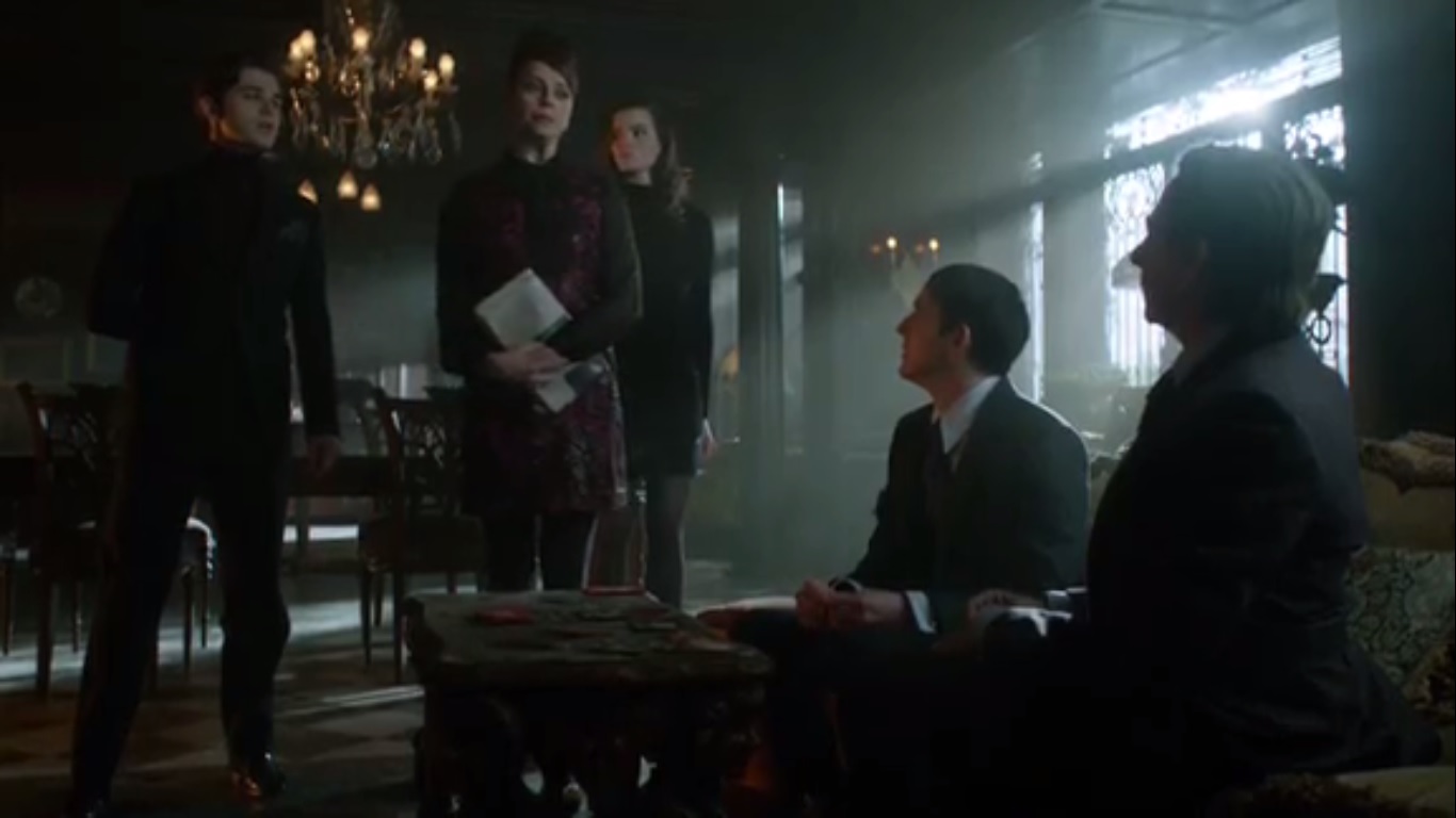 So Sasha tries to put the moves on Oswald. She asks if there’s any bad-boy Penguin left in him, because Sasha has some bad-girl and a nice pair of bad-girls. If they work together, Sasha says they could squeeze the family out. Oswald slips out, telling Sasha to restrain herself since they’re practically related. Well, that worked. Charles offers to try, but Sasha figures Oswald for simple.
