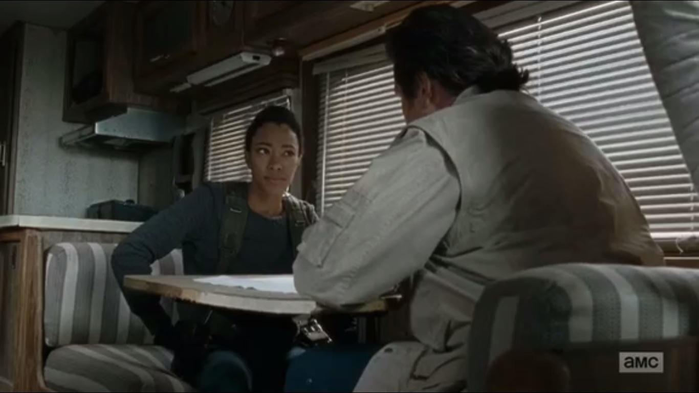 After a brief glimpse at obscure light, we return to the RV group.  Carl watches a walker approaching in the distance and asks Aaron why he didn’t stay in Alexandria.  Aaron owes Maggie.  Carl says that he’s out here because he owes them.  Eugene goes over the map for a visible route.  Shelton would work, even though it’s a longer trip.