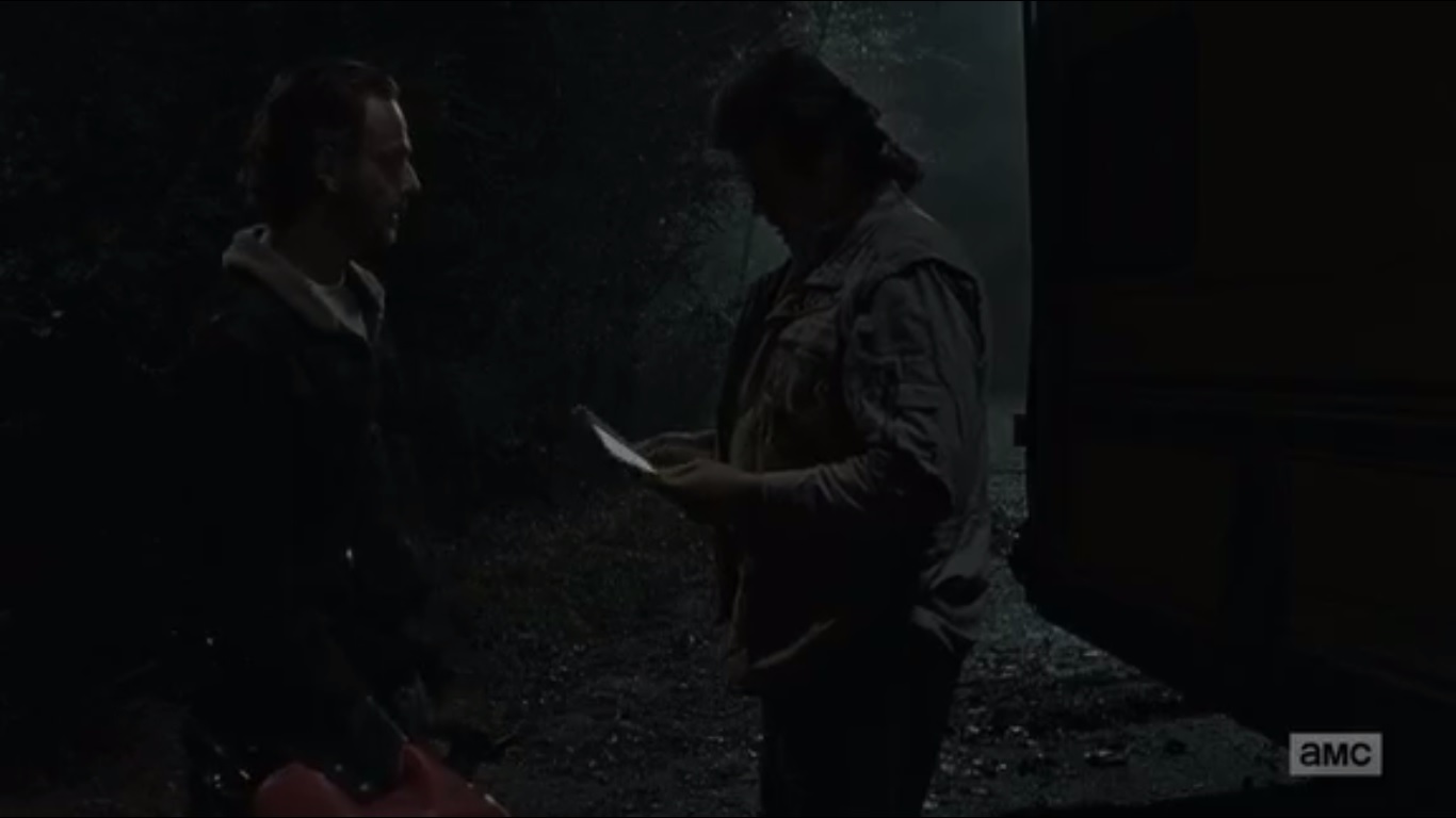 As night falls, Rick instructs Eugene to take the now gassed-up RV.  In return, Eugene gives Rick a recipe for How to Build Bullets 101.  Fair exchange.  Rick tells Eugene that they’re glad to have him here.  Eugene then asks Abraham why he never let him drive the truck.  Abraham never thought he could do it, but he was wrong.  Eugene is and always was a survivor, but no one knew it.