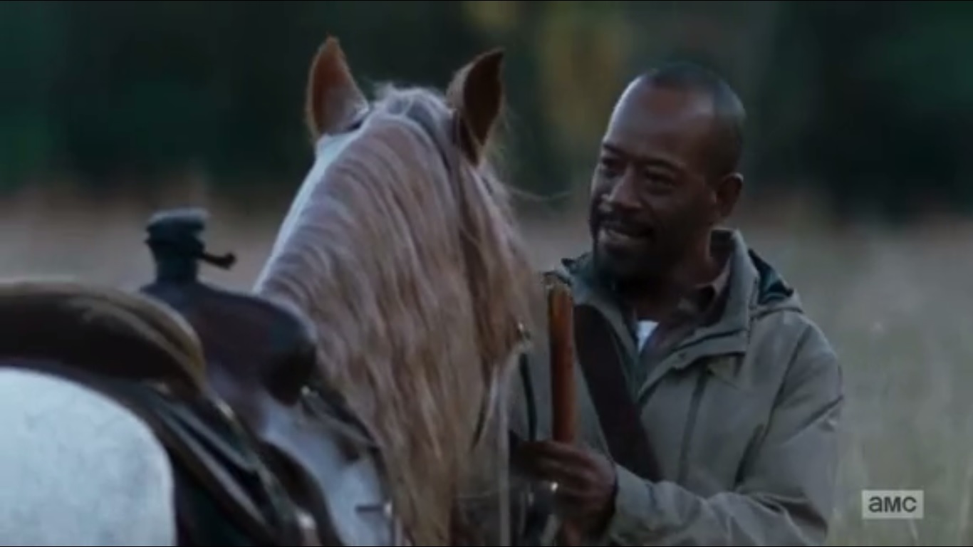 The episode begins with Morgan traversing the woods in his search for Carol.  He finds a sign that reads ‘You Are Alive’ and, near that sign, a horse that’s practically waiting for him.  Morgan tells the horse that it’s alive.  At the same time, we spot the Savior from last time, still walking with Carol’s rosary.  He continues following footprints that lead into the grassy fields.