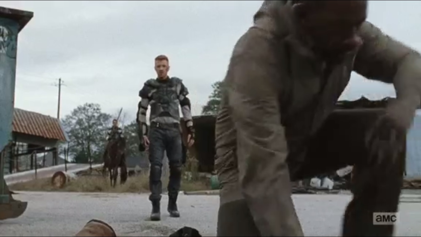 Then Morgan arrives and orders the Savior to lower his gun.  He tells the Savior that he can survive this.  Before the Savior can fire, Morgan unloads on the man, killing him.  Carol still pleads for Morgan to leave her, but Morgan insists that she’ll come back from this.  Then two men in armor, one on a horse, approach.  Morgan reports that he found their horse.  Time to get some help.