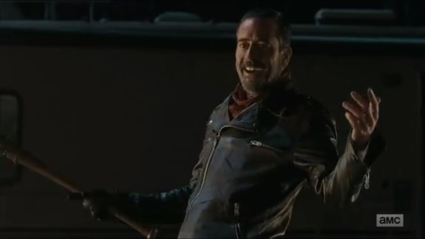 Out steps Negan, played by The Comedian himself, Jeffrey Dean Morgan.  He asks if anyone is pissing their pants yet, because they’re getting close.  Gonna be pee-pee pants city real soon.  He introduces himself to Rick, and doesn’t find it cool that Rick killed so many of his men.