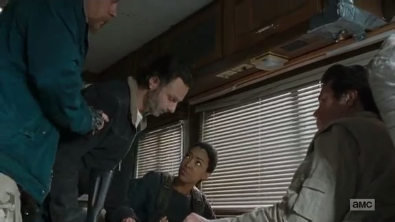 Elsewhere on the road, Rick and company travel in the RV.  Rick checks on Maggie and tells her that they’ll get to the Hilltop to make things better for her.  Maggie asks how he knows, but Rick tells her that everything they’ve done was by acting as a group.  They’re still here.  Things have happened because it’s worked out when it’s all of them.  When they work together, they can do anything.  Oh Rick, you have no idea.
